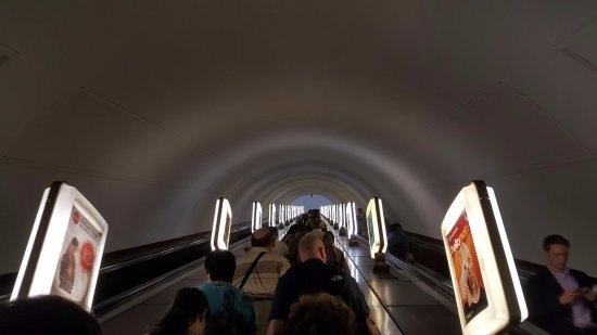 No en vano los dos tramos de escaleras mecánicas que parecen nunca acabar están flanqueados por decenas de carteles luminosos con publicidad de todo tipo; el trayecto se hace tan largo que incluso se puede ver a los pasajeros leyendo un libro o sentados en los peldaños para hacerlo más llevadero.