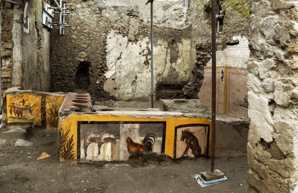 Un termopolio (thermopolium), especie de "fast-food" en plena calle en la antigua Roma, desenterrado en Pompeya (Campania, sur, cerca de Nápoles), está decorado con temáticas muy coloridas y en un estado de conservación excepcional, anunciaron este sábado los responsables del sitio.