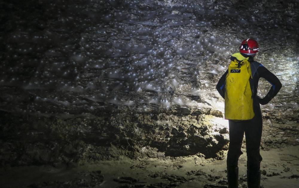 Imágenes recibidas el miércoles por la AFP muestran partes de la inmensa red colgando de la pared como una pesada cortina de terciopelo negro bajo la mirada de fascinación de un científico equipado como un espeleólogo.