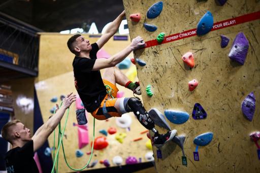 Suena música pop a todo volumen por los altavoces de un moderno rocódromo de Kiev, mientras los veteranos ucranianos, a pie del muro, empiezan a escalar con bandas elásticas enrolladas alrededor de sus piernas protésicas.