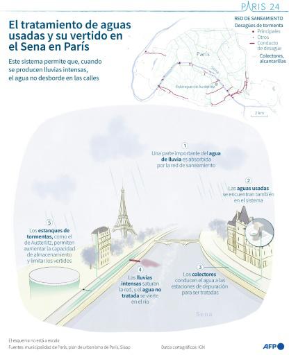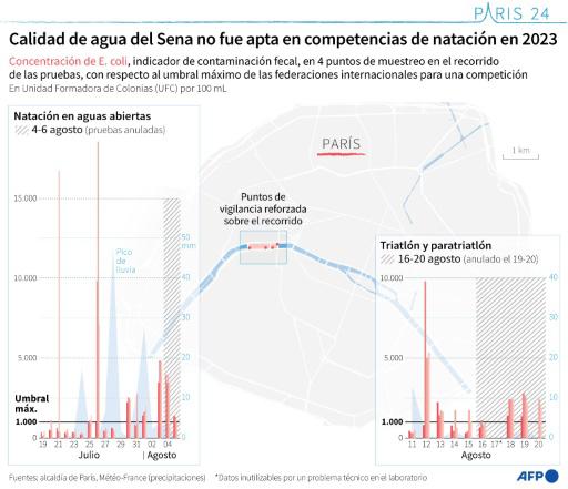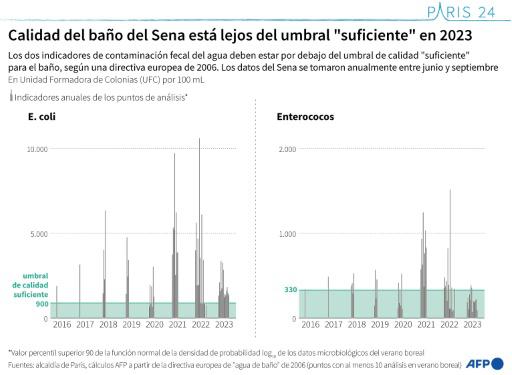 Según los resultados de los análisis transmitidos a la AFP por la alcaldía de París a mediados de 2023, ninguno de los 14 puntos de toma de muestras parisinas para el agua no alcanzó un nivel de calidad suficiente según la directiva europea al respecto, que data de 2006.