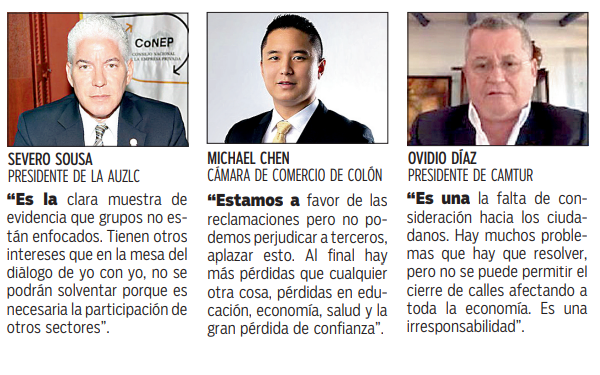Parece que se buscan otros objetivos. Este llamado a acciones es inadecuado ya que se sigue afectando la recuperación económicaRubén Castillo, presidente del Consejo Nacional de a Empresa Privada (CoNEP), manifestó que “el diálogo no es tal. Es un encuentro donde un grupo trata de imponer su criterio sin la presencia de otros sectores de la sociedad. Ningún ejercicio de entendimiento debe estar sometido a las presiones”.