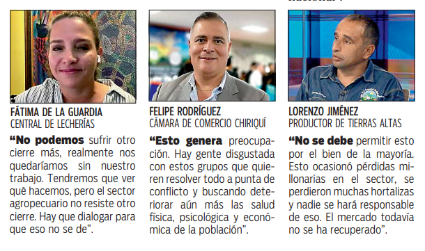 Augusto Jiménez, de la Asociación de la Comunidad Productora de Tierras Altas (ACPTA) dijo que “los cierres de calle no afectan en lo más mínimo a esos grupos porque ellos no tienen nada que perder, lo que movemos la economía los que creamos empleo fuimos los que perdimos millones de dólares en las tres semanas de cierre y ahora el escenario ha cambiado, le solicitamos a las autoridades que en esta ocasión hagan valer el uso de las facultades constituciones que nos asisten al permitirnos el libre tránsito”.