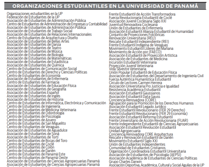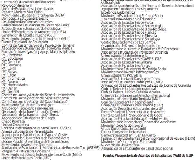 La Universidad de Panamá (UP) tiene registrado 181 asociaciones y grupos estudiantiles en su sede central y en sus 10 centros regionales, reveló un informe de la Vicerrectoría de Asuntos de Estudiantiles (VAE) de la principal casa de estudios del país.