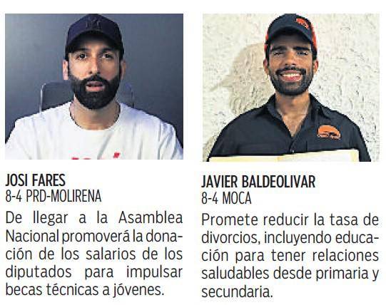 Javier Baldeolivar, candidato a diputado del 8-4 por el Movimiento Otro Camino (MOCA), tiene entre sus promesas reducir la tasa de divorcios; Josi Fares, otro de los aspirantes a una curul del 8-4 por el PRD y Molirena ofreció la donación del salario como diputado para financiar otros proyectos.