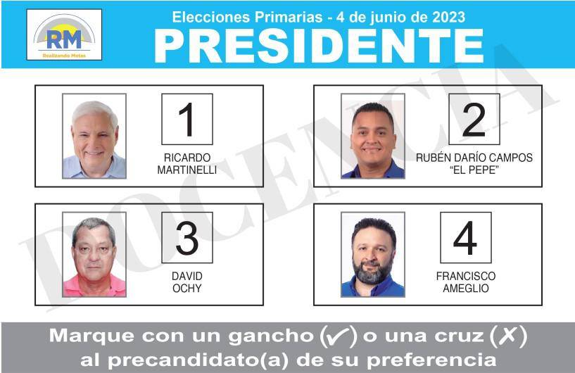 Más de 234 mil 700 personas están habilitadas para votar el próximo domingo 4 de junio, en las primarias presidenciales del partido Realizando Metas (RM). Astrid Salazar, secretaria de comunicaciones de RM detalló la agenda de votación de los precandidatos, Ricardo Martinelli le toca emitir el voto en Colegio Richard Neumann; a Rubén Darío “Pepe” Campos le corresponde en San Miguelito; Francisco Ameglio ejercerá su voto en La Chorrera; además resaltó desconocer la mesa de votación de David Ochy, otro de los precandidatos. Se espera que el TER trasmita los datos del recuenta de los votos que iniciará las 4:30 p.m. del domingo y será en el auditorio del Tribunal Electoral, en Ancón. Se tendrán más de 665 mesas de votación en 513 escuelas que ejercerán de centro de votación.